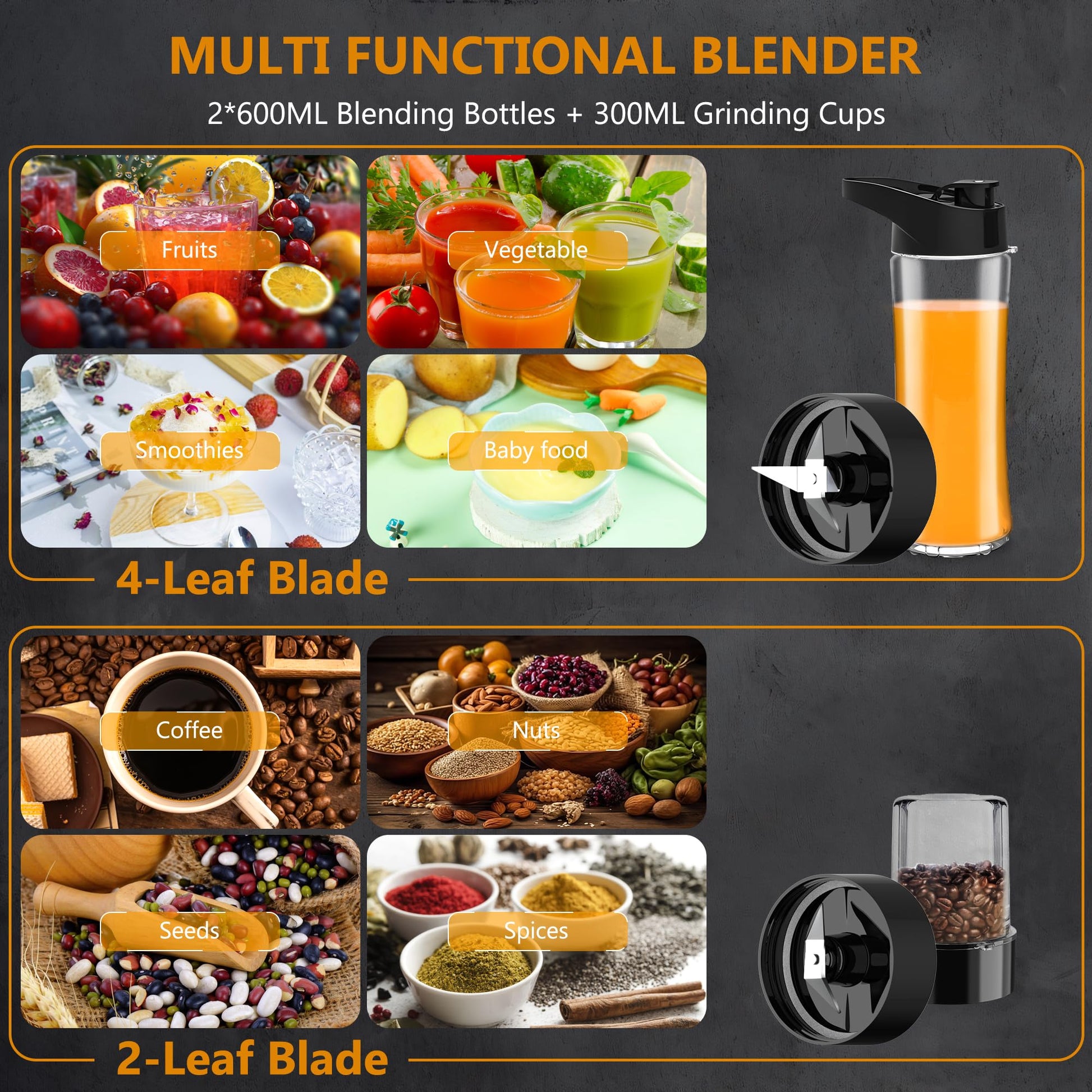 🍓【3 in 1 Multifunctional】 Die meisten Mini Smoothie Maker auf dem Markt können nur mischen, aber dieser Mixer hat sowohl Misch- als auch Mahlfunktionen, wir bieten zwei Sätze von Klingen, 4-Blatt-Klinge für Säfte, Milchshakes und Smoothies, 2-Blatt-Klinge zum Mahlen von Kaffeebohnen, Nüssen, Gewürzen, etc. Erfüllen Sie Ihre verschiedenen Bedürfnisse zur gleichen Zeit.